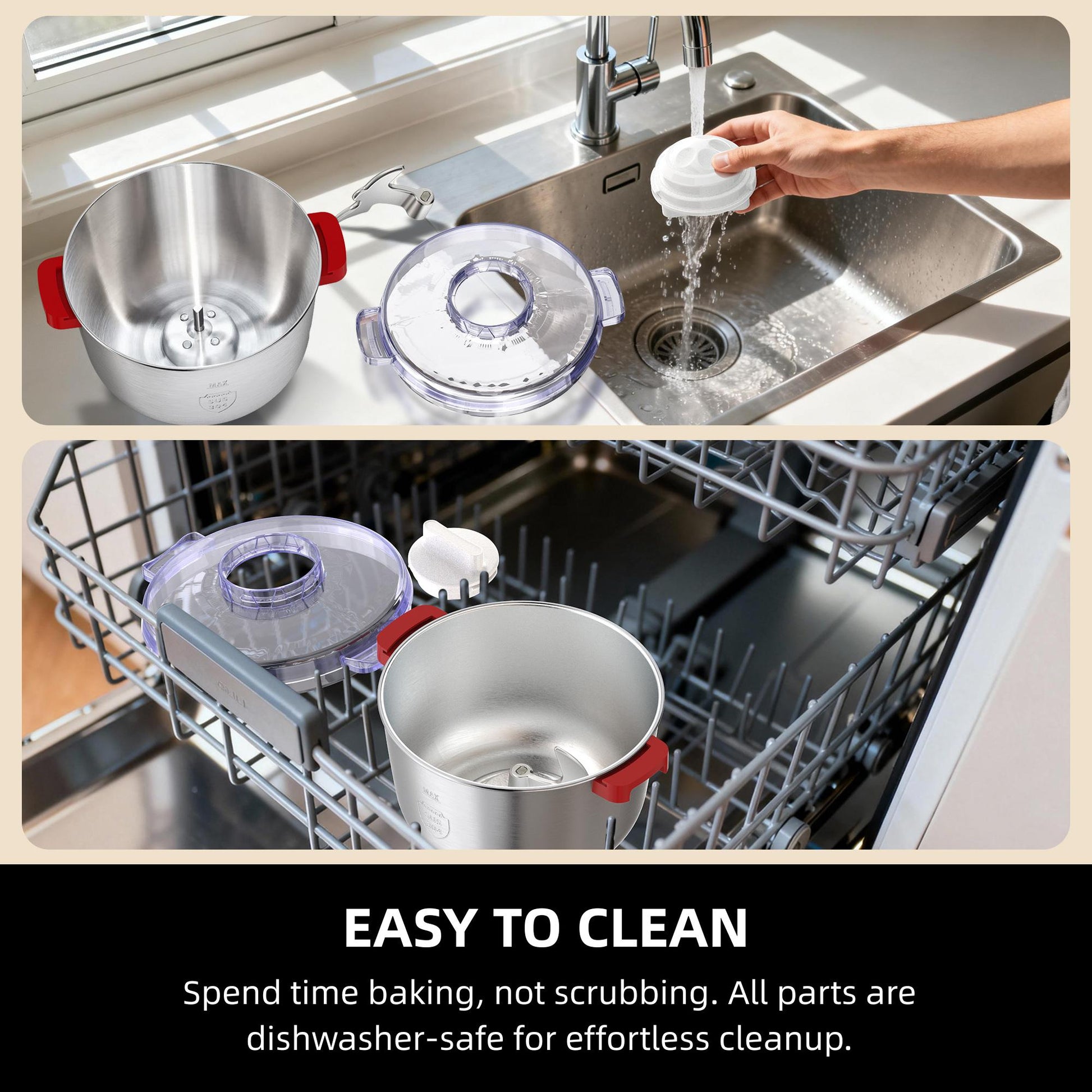 Multifunctional & Easy to Clean - Knead, Ferment, and Whisk: Includes a rust-proof stainless steel bowl, ergonomic dough hook, and efficient whisk attachment. - Quick-Release Removable Parts: BPA-free and dishwasher-safe for hassle-free cleanup.